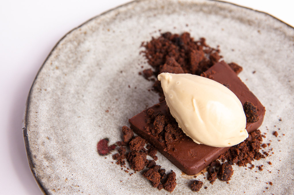We’re very lucky to have Theo Chocolate in Seattle, with its great range of organic bean to chocolate bar production and magical Wonka-like brick factory tours. Fernet Branca is an Italian amaro made with lots of herbs and spices; it’s pretty medicinal in flavor. It’s popularly thought to be a cure for overindulgence (in this case we’re preempting by serving it as part of dessert). In this ice cream recipe the medicinal qualities are balanced out nicely by the custard. I’ve been serving this with the chocolate pavé as an homage to my favorite of the Girl Scout cookies, Thin Mints.